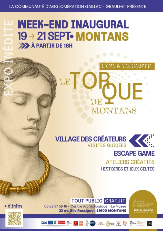 À partir du 19 septembre 2025, le Centre Archéologique de Montans accueille une exposition exceptionnelle : « L’Or et le Geste », consacrée au torque de Montans, bijou celtique d’une rare complexité, découvert de manière fortuite dans un champ de la commune en 1843 et exposé au Musée d’Archéologie nationale à Saint-Germain-en-Laye, près de Paris.